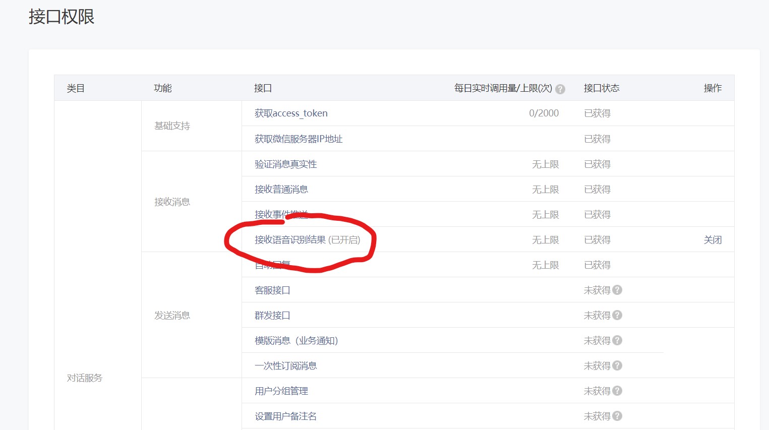 开发者进入微信公众平台 https://mp.weixin.qq.com/ —接口权限—对话服务—接受消息—打开接收语音识别结果接口权限