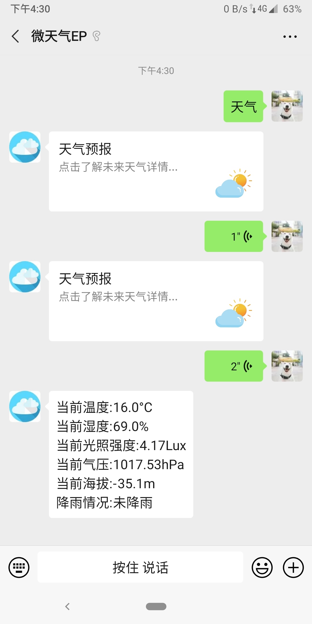 String recognition = requestMap.get("Recognition"); LOGGER.info("FromUserName is:" + fromUserName + ", ToUserName is:" + toUserName + ", MsgType is:" + msgType); if (msgType.equals(MessageUtil.REQ_MESSAGE_TYPE_VOICE)){ System.out.println(recognition); if(recognition.indexOf("环境信息")!=-1){ Map map = IoTPopApiUtil.IoTpop(); Map ioTpop = JSON.parseObject(JSONObject.toJSONString(map), Map.class); Object data = ioTpop.get("data"); String str = data.toString(); int index=str.indexOf("["); String result=str.substring(index); String jsonStr = result.substring(0, result.length() - 1); JSONArray array = JSONArray.parseArray(jsonStr); List<Pi> pi = JSONObject.parseArray(array.toJSONString(),Pi.class); String returnText="当前温度:"+pi.get(3).getValue()+"°C"+"\n" +"当前湿度:"+pi.get(2).getValue()+"%"+"\n" +"当前光照强度:"+pi.get(4).getValue()+"Lux"+"\n" +"当前气压:"+pi.get(1).getValue()+"hPa"+"\n" +"当前海拔:"+pi.get(0).getValue()+"m"+"\n" +"降雨情况:"+(pi.get(5).getValue()==1?"降雨":"未降雨"); TextMessage text = new TextMessage(); text.setContent(returnText); text.setToUserName(fromUserName); text.setFromUserName(toUserName); text.setCreateTime(LocalDateTime.now().format(DateTimeFormatter.ofPattern("yyyy-MM-dd HH:mm:ss"))); text.setMsgType(MessageUtil.RESP_MESSAGE_TYPE_TEXT); respMessage = MessageUtil.textMessageToXml(text); } if(recognition.indexOf("天气")!=-1){ NewsMessage newmsg = new NewsMessage(); newmsg.setToUserName(fromUserName); newmsg.setFromUserName(toUserName); newmsg.setCreateTime(LocalDateTime.now().format(DateTimeFormatter.ofPattern("yyyy-MM-dd HH:mm:ss"))); newmsg.setMsgType(MessageUtil.RESP_MESSAGE_TYPE_NEWS); newmsg.setFuncFlag(0); List<Article> articleList = new ArrayList<>();