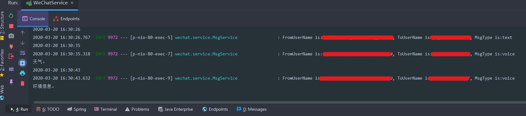 | @Service public class MsgService { private static final Logger LOGGER = LoggerFactory.getLogger(MsgService.class); public String processRequest(HttpServletRequest request) { String respMessage = null; System.out.println(LocalDateTime.now().format(DateTimeFormatter.ofPattern("yyyy-MM-dd HH:mm:ss"))); try { Map<String, String> requestMap = MessageUtil.xmlToMap(request); String fromUserName = requestMap.get("FromUserName"); String toUserName = requestMap.get("ToUserName"); String msgType = requestMap.get("MsgType"); String content = requestMap.get("Content");