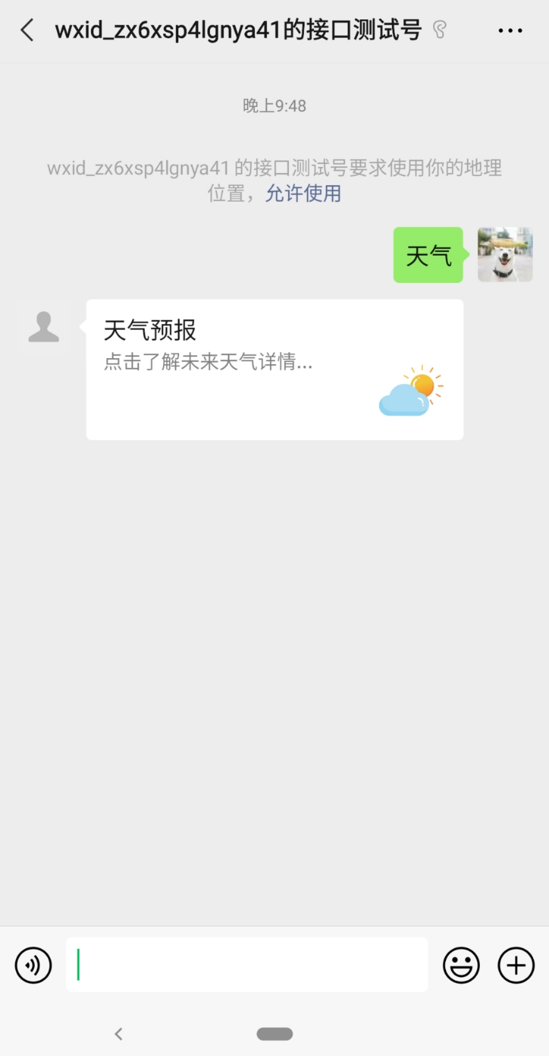 Article article = new Article(); article.setTitle("天气预报"); article.setDescription("点击了解未来天气详情..."); article.setPicUrl("https://lwy-image.oss-cn-beijing.aliyuncs.com/ep.png"); article.setUrl("https://widget-page.heweather.net/h5/index.html?bg=1&md=0123456&lc=auto&key=f1688db9422246fc969a6ba559075097"); articleList.add(article); newmsg.setArticleCount(articleList.size()); newmsg.setArticles(articleList); respMessage = MessageUtil.newsMessageToXml(newmsg); } } } catch (Exception e) { LOGGER.error("error......"); } return respMessage; } }