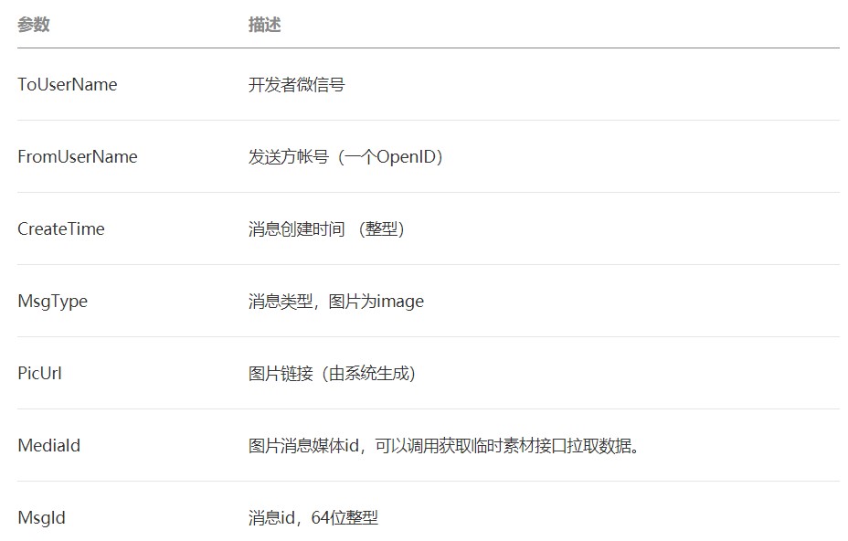 | <xml> <ToUserName><![CDATA[toUser]]></ToUserName> <FromUserName><![CDATA[fromUser]]></FromUserName> <CreateTime>1348831860</CreateTime> <MsgType><![CDATA[image]]></MsgType> <PicUrl><![CDATA[this is a url]]></PicUrl> <MediaId><![CDATA[media_id]]></MediaId> <MsgId>1234567890123456</MsgId> </xml>