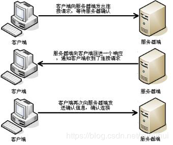 - 第三次握手,客户端再次向服务器端发送确认信息,确认连接。整个交互过程如下图所示