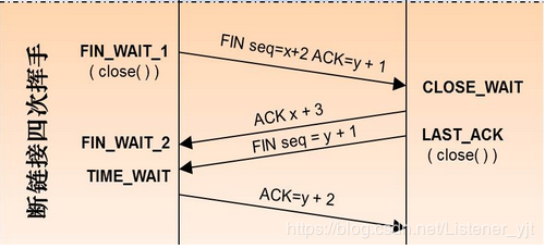 第三次挥手:服务器关闭客户端的连接,并发送一个FIN包(seq=y),进入LAST_ACK(最后确认)状态