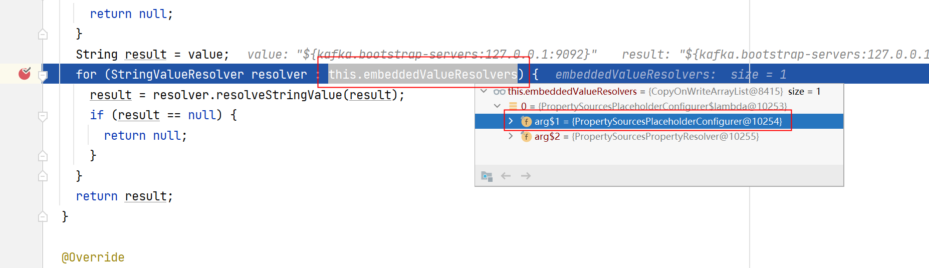 其中有一个PropertySourcesPlaceholderConfigurer类构造的StringValueResolver,调用它的resolveStringValue,最终从一个PropertySourcesPropertyResolver的propertySources中遍历所有的propertySource,其中就有Environment的propertySources,匹配到值后返回。