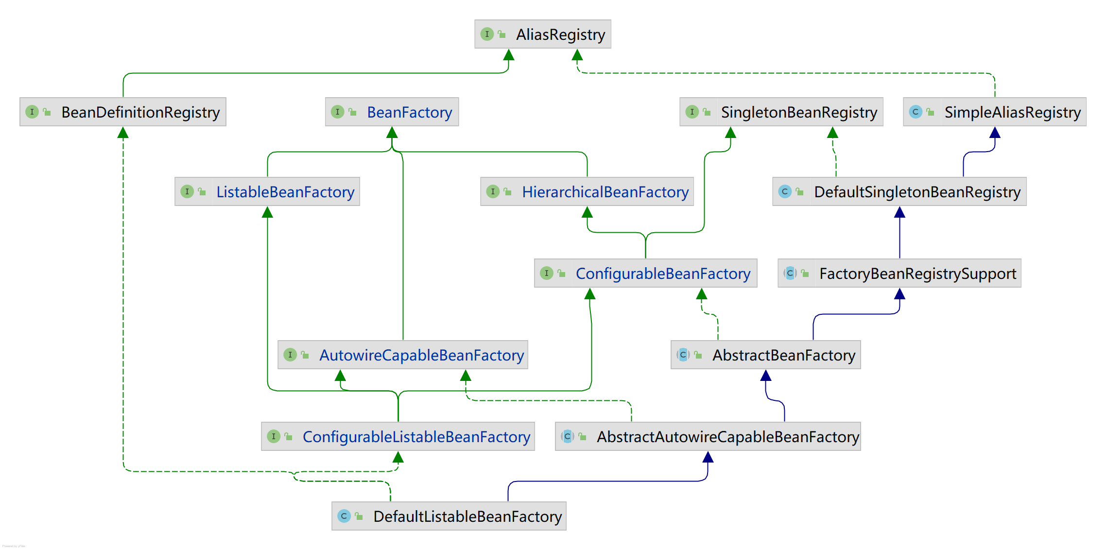 DefaultListableBeanFactory继承自AbstractAutowireCapableBeanFactory,并实现了ConfigurableListableBeanFactory和BeanDefinitionRegistry。