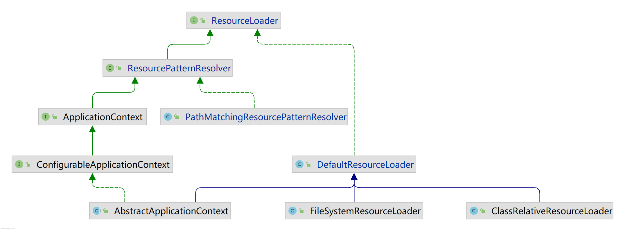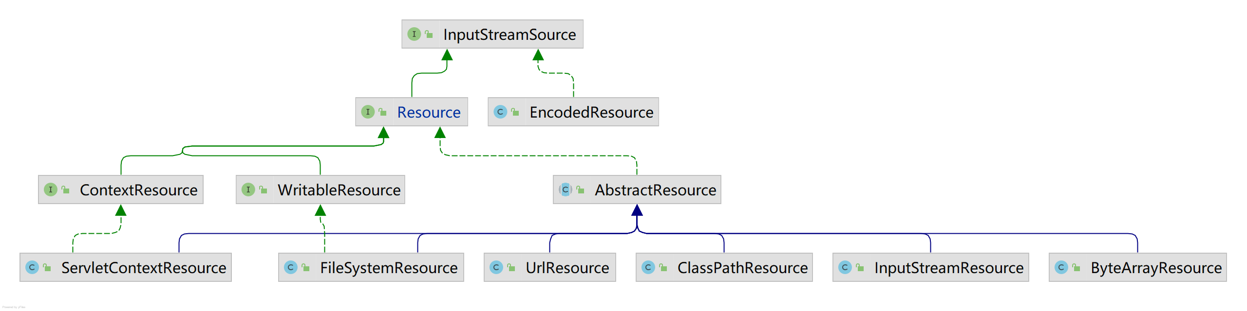 它们都继承抽象类AbstractResource,AbstractResource实现了Resource接口。自定义Resource只需继承AbstractResource抽象类,它已经实现Resource接口的大部分公共实现,再根据自定义的资源特性覆盖相应的方法。