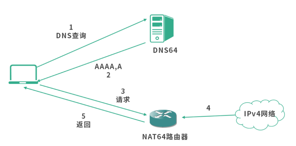 - 客户端通过DNS64服务器查询AAAA记录。(DNS64:一种解决IPv4和IPv6兼容问题的DNS服务,会把IPv4和IPv6地址同时返回)