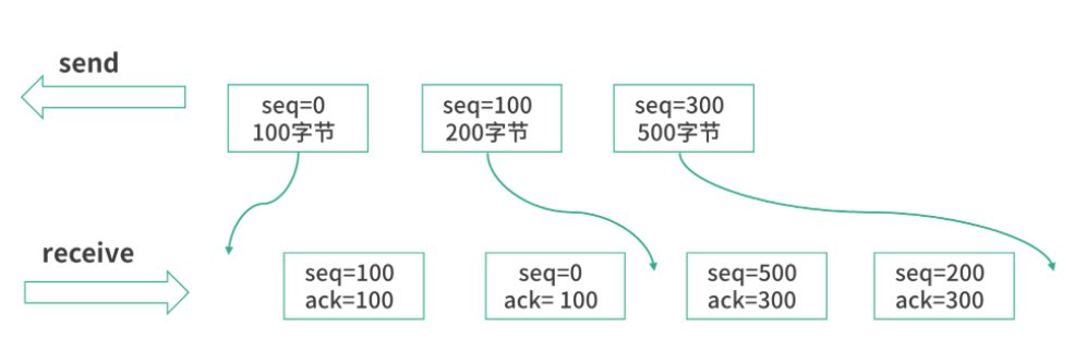 如果段4重传成功(接收到ACK),那么窗口就会继续右移。如果段4发送失败,还是没能收到ACK,那么接收方也会抛弃段5、6、7。这样从段4开始之后的数据都需要重发。