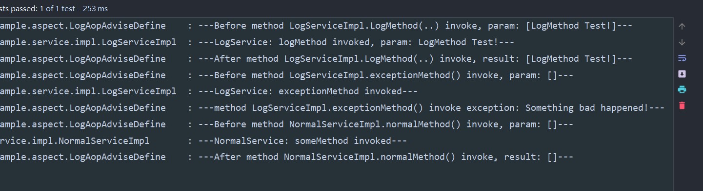 | @RunWith(SpringRunner.class) @SpringBootTest public class LogAdviseTest { @Autowired private LogService logService; @Autowired private NormalService normalService; @Test @PostConstruct public void testLogAdvise(){ logService.LogMethod("LogMethod Test!"); try { logService.exceptionMethod(); }catch (Exception e){ } normalService.normalMethod(); } }