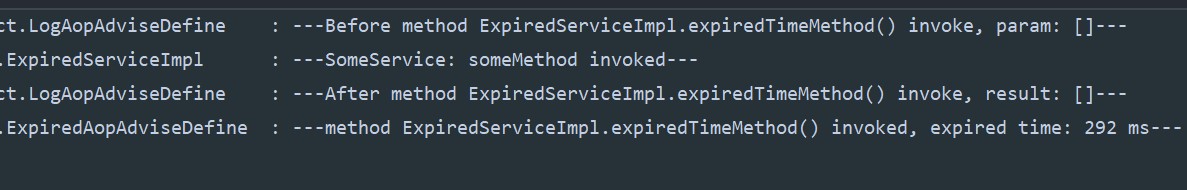 | @Component @Aspect public class ExpiredAopAdviseDefine { private Logger logger = LoggerFactory.getLogger(getClass()); @Pointcut("within(com.example.service.impl.ExpiredServiceImpl)") public void pointcut() { } @Around("pointcut()") public Object methodInvokeExpiredTime( ProceedingJoinPoint proceedingJoinPoint) { try { StopWatch stopWatch = new StopWatch(); stopWatch.start(); Object proceed = proceedingJoinPoint.proceed(); stopWatch.stop(); reportToMonitorSystem( proceedingJoinPoint.getSignature().toShortString(), stopWatch.getTotalTimeMillis()); return proceed; } catch (Throwable throwable) { throwable.printStackTrace(); return null; } } public void reportToMonitorSystem(String methodName, long expiredTime) { logger.info("---method {} invoked, expired time: {} ms---", methodName, expiredTime); } }