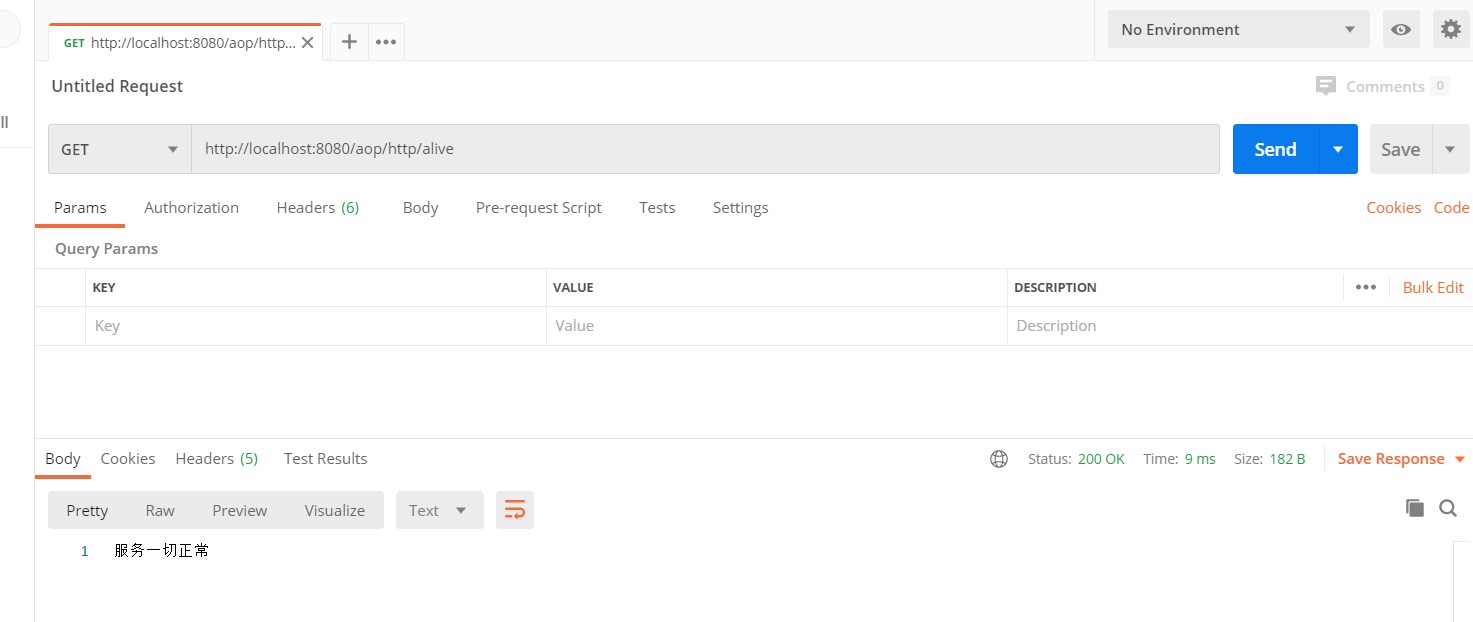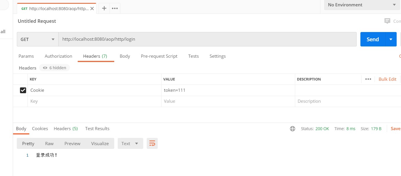 | @RestController @RequestMapping("/aop/http") public class AopController { @GetMapping("alive") public String alive(){ return "服务一切正常"; } @AuthChecker @GetMapping("login") public String login(){ return "登录成功!"; } }
