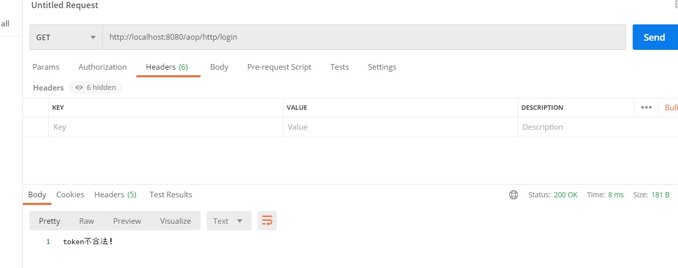 } @Around("pointcut()") public Object checkAuth(ProceedingJoinPoint proceedingJoinPoint){ HttpServletRequest request = ((ServletRequestAttributes) RequestContextHolder.getRequestAttributes()).getRequest(); String token = getToken(request); if (!token.equalsIgnoreCase("111")){ return "token不合法!"; } try { return proceedingJoinPoint.proceed(); } catch (Throwable throwable) { throwable.printStackTrace(); return null; } } private String getToken(HttpServletRequest request) { Cookie[] cookies = request.getCookies(); if (cookies == null) { return ""; } for (Cookie cookie : cookies) { if (cookie.getName().equalsIgnoreCase("token")) { return cookie.getValue(); } } return ""; } }